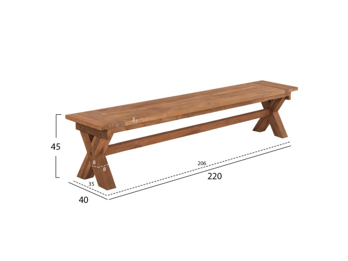 Το παγκάκι ΗΜ9564 είναι ένα λιτό και πρακτικότατο έπιπλο, τόσο για εξωτερικούς χώρους, όσο και για εσωτερικούς. Είναι κατασκευασμένο από ανακυκλωμένο ξύλο ΤΕΑΚ σε φυσικό χρώμα, ενώ τα 4 πόδια του είναι σε χιαστί διάταξη. Το χαρακτηριστικό σε αυτό το παγκάκι είναι το μέγεθός του, το οποίο είναι αρκετό να χωρέσει άνετα 4 άτομα. Συμπληρώνει ιδανικά το τραπέζι εξωτερικού χώρου ΗΜ5964 ή οποιοδήποτε άλλο ίδιας αισθητικής.