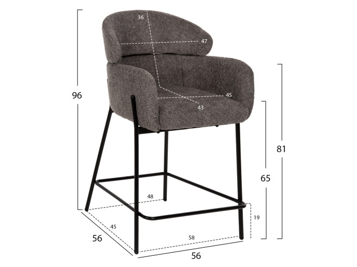 Επαγγελματικό σκαμπό bar WOLF σε ΓΚΡΙ χρώμα με ΜΑΥΡΑ μεταλλικά πόδια. Τα πόδια ενώνονται μεταξύ τους περίπου στη μέση τους με μια μεταλλική ράγα. Το σκαμπό είναι λιτό, ποιοτικό και κομψό στην όψη, και σίγουρα τραβάει τα βλέμματα με το ύφασμα μπουκλέ που είναι επενδυμένο. Είναι μεσαίου ύψους με πλάτη η οποία αγκαλιάζει το σώμα ενώ διαθέτει σχετικά ψηλά μπράτσα, πράγμα που επιτείνει τον αναπαυτικό χαρακτήρα αυτού του σκαμπό.