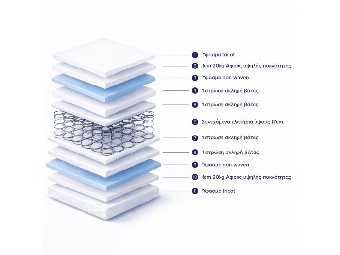 Η καρδιά του στρώματος αποτελείται από συνεχόμενα ελατήρια ύψους 17 εκ, με πάχος 1,8 χλστ.