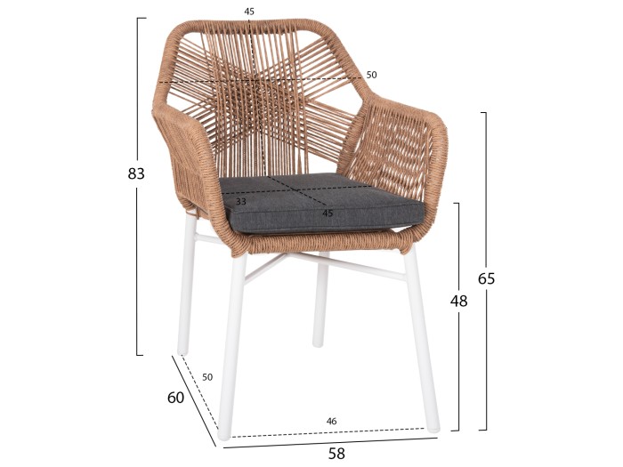 Η πολυθρόνα αλουμινίου TOPIN σε ΛΕΥΚΟ χρώμα, κυρίως για επαγγελματική χρήση, είναι πανέμορφη! Μοντέρνα, άνετη και σταθερή. Ο σχεδιασμός της με την μεσαίου ύψους πλάτη και τα χαμηλά μπράτσα, όλα από ανοιχτό ΚΑΦΕ συνθετικό «τυλιχτό» Rattan (μοιάζει με σχοινί), και το μαξιλάρι καθίσματος σε ΓΚΡΙ χρώμα, θα αναβαθμίσει αισθητικά τον χώρο που θα την τοποθετήσετε και θα τραβήξει τα βλέμματα.