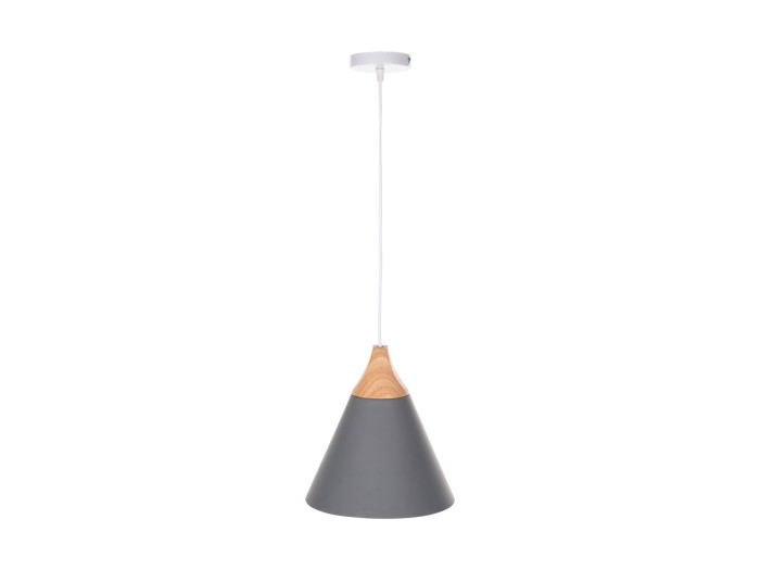 Ανακαλύψτε αυτό το νέο μας κρεμαστό φωτιστικό οροφής και ολοκληρώστε την διακόσμησή σας. Πρόκειται για ένα φωτιστικό με ΓΚΡΙ μεταλλικό καπέλο σε σχήμα καμπάνας με λεπτομέρεια ξύλου στην κορυφή του φωτιστικού. Αισθητικά, ολοκληρώνεται με το λευκό καλώδιο κρέμασης και την λευκή βάση οροφής, και αποτελεί την τελευταία τάση στα φωτιστικά οροφής.