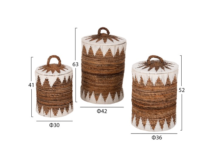 Το σετ 3 καλαθιών δαπέδου HM4306 αποτελείται από 3 στρογγυλά καλάθια σε διαφορετικά μεγέθη. Το χαρακτηριστικό τους είναι ότι διαθέτουν καπάκι και μπορείτε να τα χρησιμοποιήσετε με διάφορους τρόπους, και είναι κατασκευασμένα από ψάθα σε φυσικό και λευκό χρώμα, αριστοτεχνικά πλεγμένο.