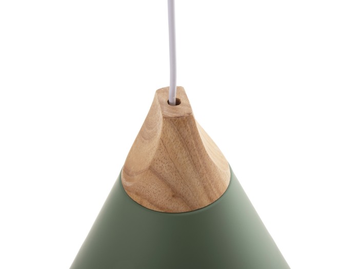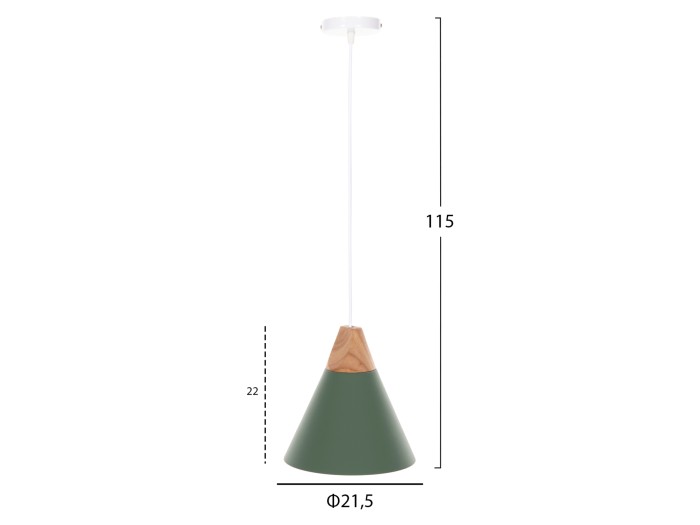 Ανακαλύψτε αυτό το νέο μας κρεμαστό φωτιστικό οροφής και ολοκληρώστε την διακόσμησή σας. Πρόκειται για ένα φωτιστικό με ΠΡΑΣΙΝΟ μεταλλικό καπέλο σε σχήμα καμπάνας με λεπτομέρεια ξύλου στην κορυφή του φωτιστικού. Αισθητικά, ολοκληρώνεται με το λευκό καλώδιο κρέμασης και την λευκή βάση οροφής, και αποτελεί την τελευταία τάση στα φωτιστικά οροφής.