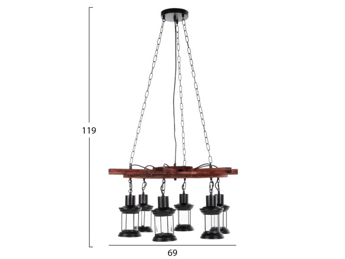 Ανακαλύψτε το εντυπωσιακό 6-φωτο φωτιστικό οροφής HM4116. Ένα φωτιστικό που θα αποτελέσει το κέντρο του ενδιαφέροντος χάρη στο εντυπωσιακό και εμπνευσμένο του design. Τα 6 φαναράκια που περιέχουν τους λαμπτήρες κρέμονται από μια ξύλινη τιμονιέρα πλοίου (πηδάλιο), η οποία με την σειρά της κρέμεται από την οροφή με αλυσίδες.