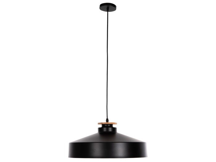 Ανακαλύψτε αυτό το νέο μας κρεμαστό φωτιστικό οροφής και ολοκληρώστε την διακόσμησή σας. Πρόκειται για ένα φωτιστικό με ΜΑΥΡΟ ρηχό μεταλλικό καπέλο σε σχήμα καμπάνας με λεπτομέρεια ξύλου στην κορυφή του φωτιστικού. Αισθητικά, ολοκληρώνεται με το μαύρο καλώδιο κρέμασης και την λευκή βάση οροφής, και αποτελεί την τελευταία τάση στα φωτιστικά οροφής.
