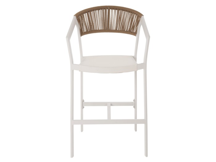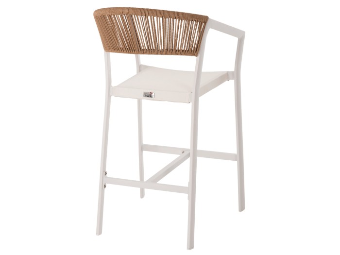 Η πλάτη του σκαμπό είναι επενδυμένη με πολυεστερικό RATTAN. Στα περισσότερα έπιπλα κήπου και γενικά σε έπιπλα για εξωτερικούς χώρους χρησιμοποιείται συνθετικό υλικό από PVC, δηλαδή τεχνητές ίνες υψηλής ποιότητας. Αυτό δίνει στην κατασκευή εξαιρετική αντοχή και ανθεκτικότητα σε ακραίες συνθήκες ζέστης ή κρύου.
