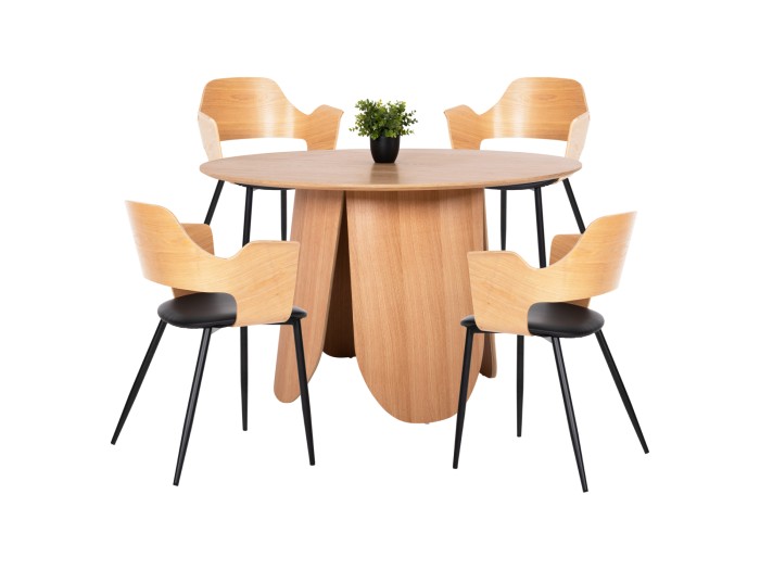 Αυτό το σετ τραπεζαρίας εσωτερικού χώρου αποτελείται από ένα τραπέζι DENTY και 4 καρέκλες VELP. Το DENTY είναι ένα στρογγυλό τραπέζι για την τραπεζαρία, με φαλτσοκομμένη επιφάνεια από MDF με καπλαμά δρυός σε χρώμα ΔΡΥΟΣ. Η επιφάνεια αυτή στηρίζεται σε μία πανέμορφη ξύλινη κυλινδρική βάση με ίδιο χρωματισμό. Οι καρέκλες VELP έχουν κάθισμα σε ΜΑΥΡΗ απόχρωση και ΜΑΥΡΑ μεταλλικά πόδια. Αυτό, όμως, που ξεχωρίζει είναι ότι ολόκληρη η πλάτη είναι ξύλινη σε ΦΥΣΙΚΟ χρώμα ΔΡΥΟΣ κι είναι κυρτή και αναπαυτική.