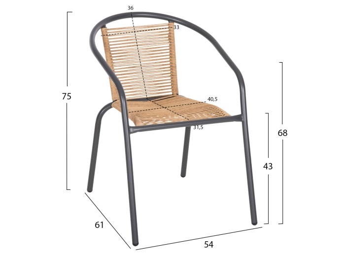 Η πλάτη και το κάθισμα αποτελούνται από εξαιρετικής ποιότητας συνθετικό Rattan. Το συνθετικό Rattan είναι συνθετικό υλικό από πολυεστέρα, δηλαδή τεχνητές ίνες υψηλής ποιότητας. Αυτό δίνει εξαιρετική αντοχή και ανθεκτικότητα σε ακραίες συνθήκες ζέστης ή κρύου.