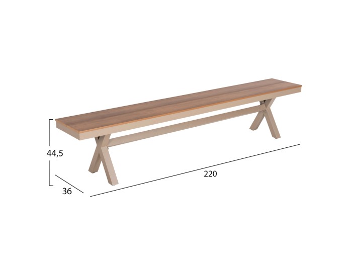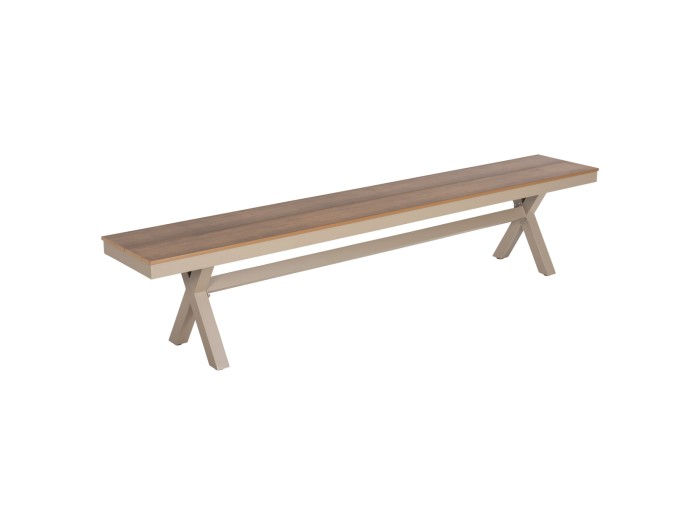 Το παγκάκι εξωτερικού χώρου TAWNEE έχει σκελετό αλουμινίου σε ΣΑΜΠΑΝΙ χρώμα, με δύο χιαστί βάσεις ενωμένες με μια οριζόντια φαρδιά ράβδο. Η επιφάνεια του καθίσματος είναι κατασκευασμένη από δύο πλάκες polywood σε χρώμα ΦΥΣΙΚΟΥ ΞΥΛΟΥ. Οι πλούσιες διαστάσεις του που άνετα βολεύονται 4 άτομα, το καθιστούν όμορφη και πρακτική προσθήκη για πληθώρα χρήσεων τόσο στο σπίτι, όσο και σε επαγγελματικούς χώρους.