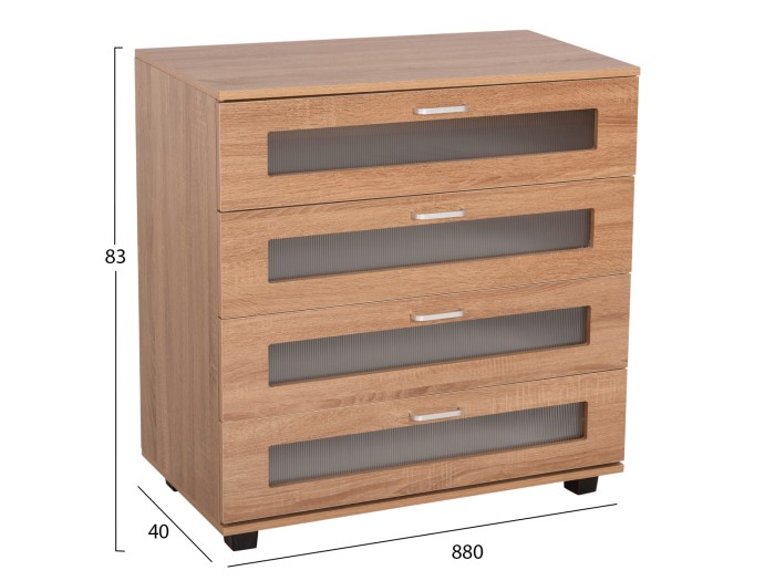 Η THORGAN είναι μια μεγάλη συρταριέρα με 4 φαρδιά συρτάρια που θα ικανοποιήσει όλες τις ανάγκες σας. Έχει ουδέτερο χρώμα ΣΟΝΟΜΑ με χερούλια σε ασημί απόχρωση. To χαρακτηριστικό που κάνει αυτή την συρταριέρα να ξεχωρίζει είναι ότι τα συρτάρια έχουν παραθυράκια από ημιδιαφανές πολυκαρβονικό γυαλί. Τα μαύρα ποδαράκια της συρταριέρας, είναι σταθερά και φαρδιά προσφέροντας στιβαρότητα στην κατασκευή και ταυτόχρονα δημιουργούν μια ευχάριστη διχρωμία με το κυρίως σώμα της συρταριέρας.