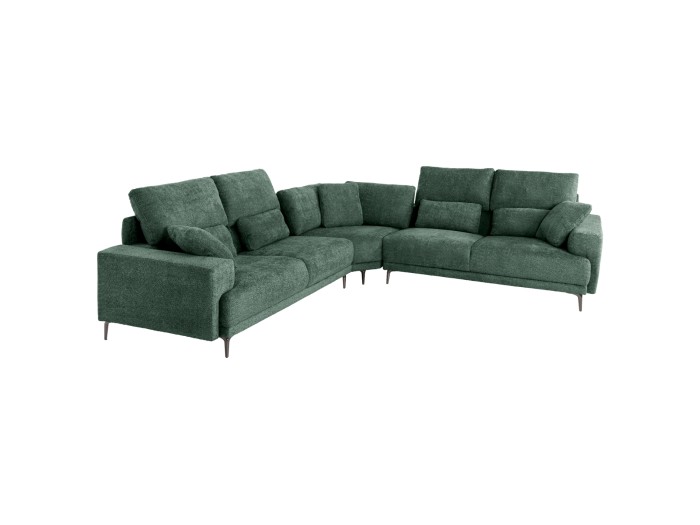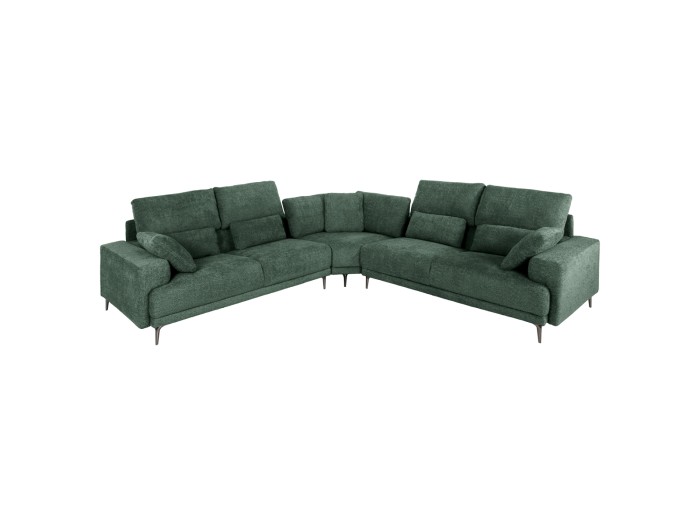 Ο SYMMET είναι ένας θαυμάσιος μεγάλος γωνιακός καναπές που αποτελείται από 3 κομμάτια. Τις δύο ίσες και όμοιες συμμετρικές πλευρές και μία γωνία που τις ενώνει με αναρτήρες πάνελ. Η επένδυση έχει γίνει με ποιοτικό ανάγλυφο ύφασμα σε ΠΡΑΣΙΝΟ χρώμα, ενώ τα πόδια είναι ψηλά και μεταλλικά σε γυαλιστερό ΑΝΘΡΑΚΙ χρώμα. Από πλευράς design, ο καναπές έχει φαρδιά και άνετα μπράτσα ενώ η πλάτη στις δύο πλευρές είναι κοντή αλλά διαθέτει αναδιπλούμενα μέρη που χρησιμεύουν ως επιπλέον στηρίγματα για τα μαξιλάρια πλάτης. Διαθέτει 4 μεγάλα μαξιλάρια πλάτης και άλλα 9 μικρότερα, πράγμα που απογειώνει την άνεση που προσφέρει. Το κάθισμα διαθέτει γεμίσματα αφρού μεσαίας σκληρότητας σε συνδυασμό με ελατήρια pocket springs, προσφέροντας, επίσης, απαράμιλλη άνεση.