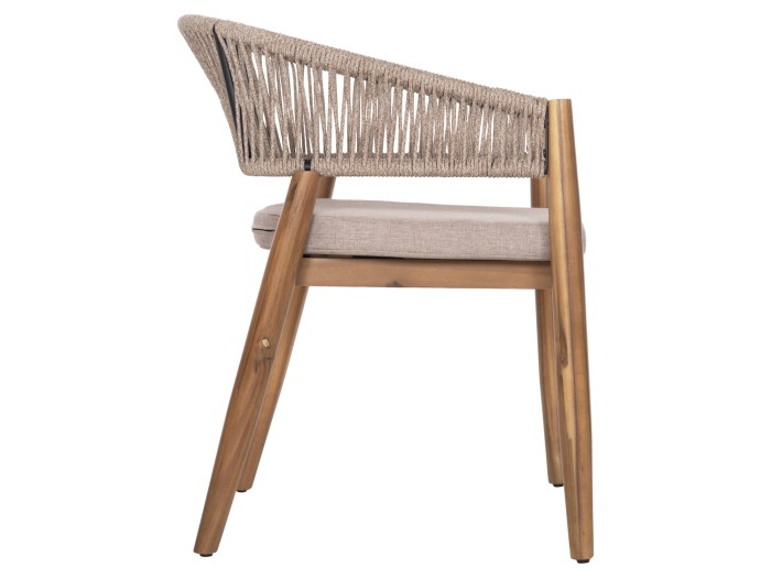 Η πολυθρόνα τραπεζαρίας εξωτερικού χώρου NAVAN συνδυάζει αρμονικά διαφορετικά υλικά κατασκευής. Τα πόδια είναι από ξύλο ακακίας στο ΦΥΣΙΚΟ του χρώμα, ενώ ο σκελετός της πλάτης είναι μεταλλικός με πλέξη από nylon σχοινί σε ΜΠΕΖ χρώμα. Το κάθισμα διαθέτει μαξιλάρι με πολυεστερικό ύφασμα επίσης σε ΜΠΕΖ χρώμα. Οι σχεδιαστικές γραμμές είναι κομψές και με γνώμονα την άνεση του χρήστη και θα αποτελέσει το κέντρο ενδιαφέροντος οπουδήποτε και αν τοποθετηθεί, ιδιαίτερα όμως αν συνδυαστεί με το ανάλογο τραπέζι.