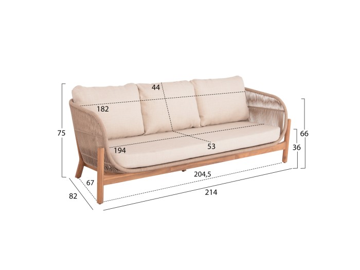 Σας παρουσιάζουμε το νέο σετ σαλονιού εξωτερικού χώρου SANJI που αποτελείται από στρογγυλό τραπεζάκι, 2 πολυθρόνες και 1 τριθέσιο καναπέ. Τα πόδια σε όλο το σετ είναι από ποιοτικό ξύλο ακακίας σε ΦΥΣΙΚΟ χρώμα, όπως και ολόκληρο το τραπεζάκι. Ο σκελετός των καθισμάτων τόσο στις πολυθρόνες όσο και στον καναπέ είναι από αλουμίνιο επενδυμένος με σχοινί σε ανοιχτό ΜΠΕΖ χρώμα! Τα μαξιλάρια σε όλο το σετ είναι επενδυμένα με πολυεστερικό ύφασμα σε ΜΠΕΖ χρώμα και διαθέτουν γέμισμα με μέτριας σκληρότητας αφρώδη υλικά για την μεγαλύτερη δυνατή άνεση, αλλά και φερμουάρ. Τι άλλο να ζητήσει κανείς για να αναβαθμίσει τον εξωτερικό χώρο του;