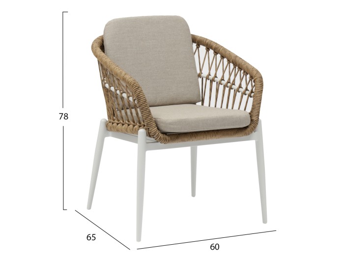 Η πολυθρόνα αλουμινίου GALDIN, τόσο για επαγγελματική χρήση όσο και για το σπίτι, διαθέτει πλάτη και κάθισμα σε μορφή bucket με πλέξη wicker από P.E. Rattan σε ΦΥΣΙΚΟ χρώμα, ενώ τα μαξιλάρια πλάτης και καθίσματος, που διαθέτουν και φερμουάρ, είναι σε ΜΠΕΖ απόχρωση. Ο σκελετός είναι σε ΛΕΥΚΟ χρώμα.