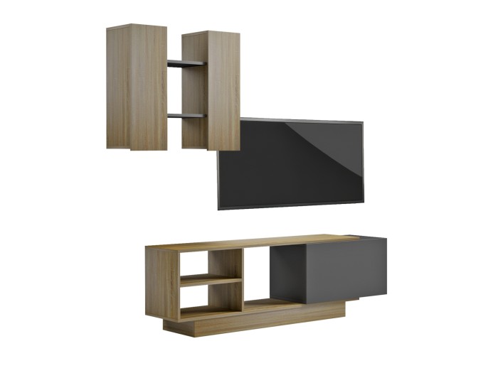 Το TYSON είναι μια μοντέρνα και πρακτική σύνθεση τηλεόρασης σε SONAMA και ΓΚΡΙ χρώμα, που θα ομορφύνει το σαλόνι σας! Το κυρίως έπιπλο είναι μακρύ και διαθέτει 1 ντουλάπι για αποθήκευση αντικειμένων, και 3 ανοιχτούς χώρους για την τοποθέτηση ηλεκτρονικών συσκευών, μικροαντικειμένων, και βιβλίων. Η σύνθεση ολοκληρώνεται με 2 ντουλάπια τοίχου με εσωτερικά ράφια που «ενώνονται» με άλλα δύο επιτοίχια ανοιχτά ράφια. Πρόκειται για μια λιτή, κομψή και ολοκληρωμένη πρόταση για το σαλόνι σας!