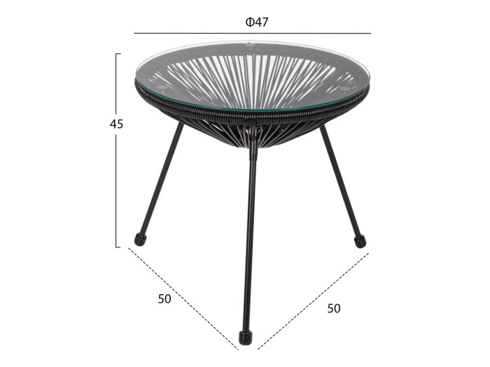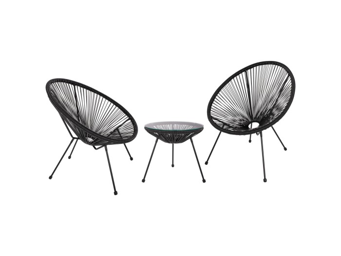 Το ACAPULCO είναι ένα σετ σαλονιού εξωτερικού χώρου σε εξολοκλήρου ΜΑΥΡΟ χρώμα, με στρογγυλό τραπεζάκι με γυάλινη επιφάνεια και 2 αναπαυτικές πολυθρόνες τύπου φωλιάς! Η επένδυση σε όλο το σετ είναι από P.E.RATTAN επάνω σε μαύρους μεταλλικούς σκελετούς. Το Wicker δεν είναι υλικό, είναι μέθοδος κατασκευής επίπλων κυρίως για εξωτερικούς χώρους, με βασικό υλικό το συνθετικό Rattan.