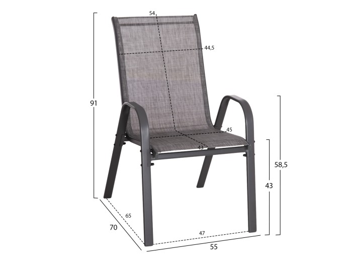 Το κάθισμα και η πλάτη είναι από textline (ή textilene) υψηλής ποιότητας 2x1 (540g). Αυτό είναι ένα παχύ, ισχυρό και ανθεκτικό πολυεστερικό ύφασμα. Σημαίνει ότι είναι κατασκευασμένο από πολυεστερικά νήματα με PVC.