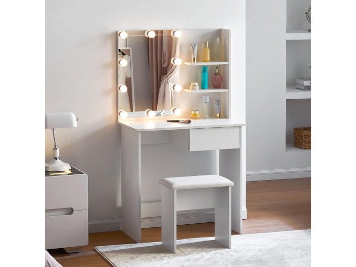 Η νέα τουαλέτα LAURYN είναι ένα πρακτικότατο έπιπλο σε χρώμα ΛΕΥΚΟ που θα αλλάξει την εικόνα του χώρου σας. Αποτελείται από ένα τραπέζι με καθρέπτη και 1 συρτάρι κάτω από την επιφάνεια. Αυτό όμως που κερδίζει τις εντυπώσεις είναι ότι ο καθρέπτης συνοδεύεται από φώτα LED περιμετρικά, καθώς και από 2 ραφάκια που δημιουργούν 3 χώρους τοποθέτησης αντικειμένων στην δεξιά πλευρά, απογειώνοντας την χρησιμότητα του επίπλου.