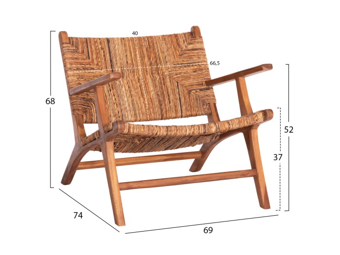 Η πολυθρόνα TONDO είναι κοντή και φαρδιά με μπράτσα, απαράμιλλης ομορφιάς. Ο σκελετός είναι από ποιοτικό ξύλο σε ΦΥΣΙΚΟ χρώμα, ενώ τόσο η μεσαίου ύψους πλάτη όσο και το φαρδύ κάθισμα αποτελούνται από σχοινί μπανάνας (ψάθα) στο ΦΥΣΙΚΟ του χρώμα. Οι σχεδιαστικές γραμμές είναι κομψές και με γνώμονα την άνεση του χρήστη, με χαρακτηριστικό παράδειγμα το κοντό κάθισμα με την έντονη κλίση και την πλάτη με την επίσης χαρακτηριστική κλίση προς τα πίσω.