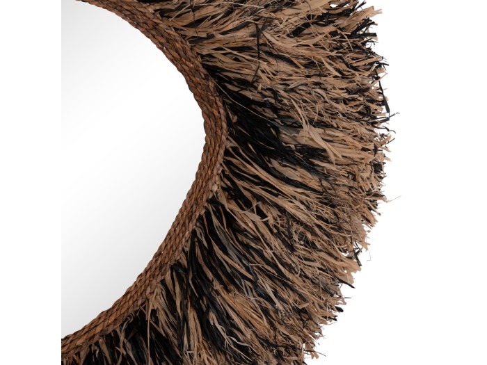 O καθρέπτης GRESSO είναι πραγματικά ένα εντυπωσιακό κομμάτι στην διακόσμηση του χώρου σας! Το design του είναι μοναδικό με το αριστοτεχνικά κατασκευασμένο ακανόνιστο πλαίσιο από ίνες φλοιού μπανάνας, το οποίο στο κέντρο του «φιλοξενεί» τον καθρέπτη. Οι ίνες είναι σε μαύρο και φυσικό χρώμα και ο καθρέπτης αποτελεί ένα χαρακτηριστικό δείγμα boho αισθητικής και διακόσμησης. Είναι ιδανικός τόσο για το σπίτι όσο και για επαγγελματικούς χώρους όπως ξενοδοχεία, Airbnb, χώρους εστίασης ως διακοσμητικό στοιχείο κτλ.