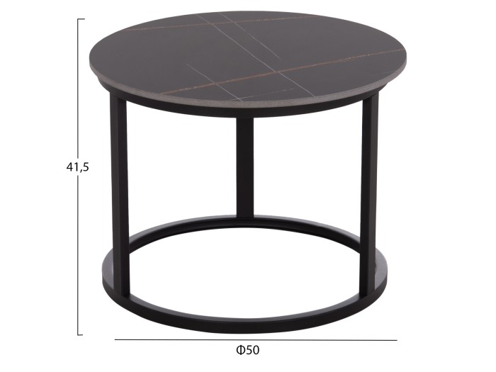 Τα τραπεζάκια TALOS θα σας ενθουσιάσουν με το στυλ και την πρακτικότητά τους. Πρόκειται για 2 τραπεζάκια ένα ψηλότερο κι ένα πιο κοντό με ιδιαίτερο χαρακτηριστικό ότι το ψηλότερο στηρίζεται σε μια ημικυκλική βάση με τρία μεταλλικά πόδια, πράγμα που επιτρέπει στο πιο κοντό να χωράει και να αποθηκεύεται ακριβώς από κάτω. Οι βάσεις και των δύο τραπεζιών είναι μεταλλικές σε μαύρο χρώμα, ενώ οι επιφάνειές τους είναι κεραμικές σε χρώμα ΜΑΥΡΟΥ ΜΑΡΜΑΡΟΥ.