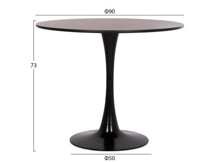 Ένα στρογγυλό τραπέζι με ΜΑΥΡΗ μεταλλική βάση και επιφάνεια από MDF σε ΜΑΥΡΟ χρώμα, και 4 καρέκλες με βελούδινη επένδυση σε ΜΑΥΡΟ χρώμα με ΜΑΥΡΑ μεταλλικά πόδια με χρυσές λεπτομέρειες στο κάτω μέρος.