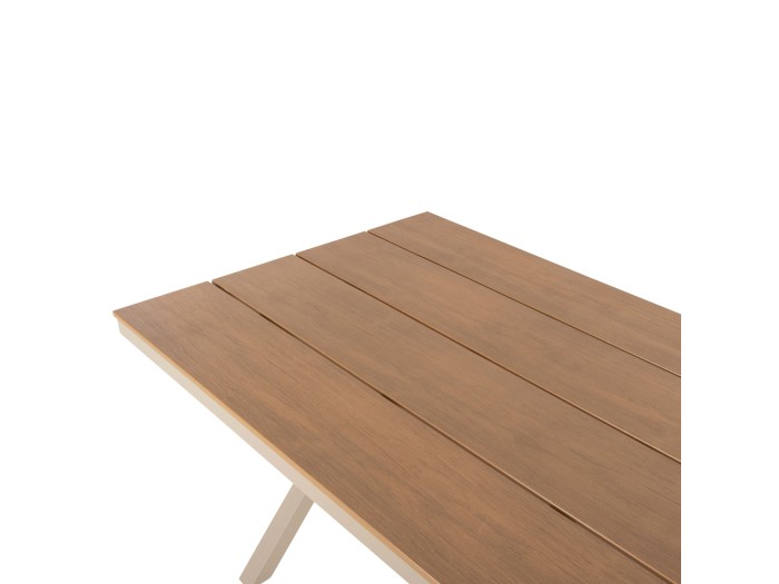 Αυτό το Σετ τραπεζαρίας εξωτερικού χώρου διαθέτει τραπέζι με σκελετό αλουμινίου σε ΣΑΜΠΑΝΙ χρώμα και επιφάνεια από πλάκες polywood (είδος πλαστικής ξυλείας που είναι φιλική προς το περιβάλλον και απαιτεί ελαφρά συντήρηση ενώ είναι αδιάβροχη και αντιστέκεται σε όλα τα είδη σήψης και μούχλας), και 4 πολυθρόνες με ίδια υλικά κατασκευής.