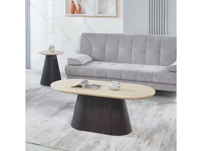 Το τραπέζι σαλονιού CATER είναι οβάλ και αποτελεί νέα προσθήκη στην γκάμα μας. Η επίπεδη επιφάνειά του είναι κεραμική σε χρωματισμό TRAVERTINE STONE, ενώ η βάση του είναι κατασκευασμένη εξολοκλήρου από MDF σε χρώμα ΣΚΟΥΡΟ ΚΑΦΕ, με όμορφες πτυχώσεις.