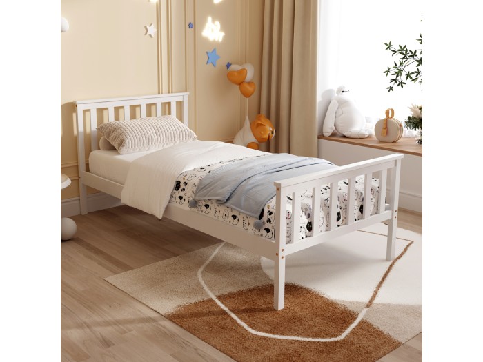 Το παιδικό κρεβάτι GIMLY σε διάσταση για στρώμα 90x190 εκ, είναι κατασκευασμένο από ξύλο πεύκου σε ΛΕΥΚΟ χρώμα, με ψηλά πόδια, ενώ το στρώμα τοποθετείται σε τάβλες από κόντρα-πλακέ ξυλεία.