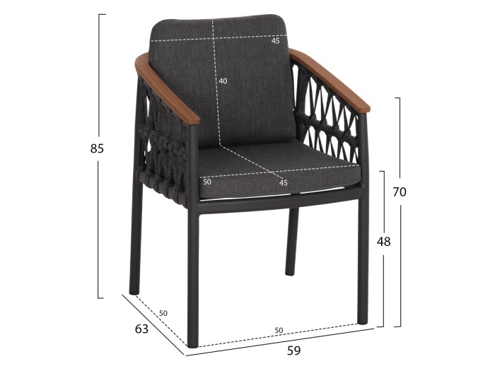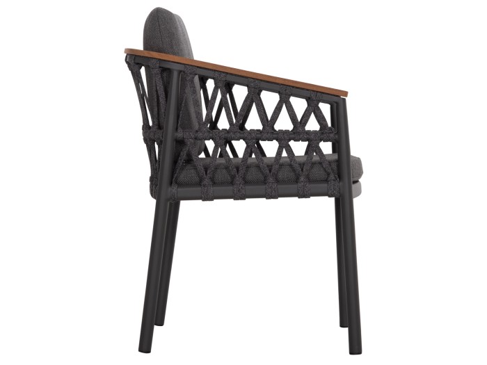 Ο αρμονικός συνδυασμός του σκούρου γκρι αλουμινίου, του strap σχοινιού και του ξύλου teak στα μπράτσα δημιουργεί ένα αποτέλεσμα διακριτικής πολυτέλειας που ταιριάζει σε κάθε μοντέρνο εξωτερικό χώρο.