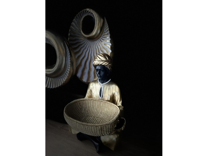 Η διακοσμητική φιγούρα VEDAS, διαστάσεων 19x18x27cm, είναι κατασκευασμένη από πολυρεζίνη και απεικονίζει μια φιγούρα σε καθιστή στάση με τουρμπάνι και χρυσή φορεσιά, κρατώντας μπροστά της ένα καλάθι. Ο συνδυασμός χρυσού και μαύρου προσδίδει αρχοντική και εξωτική αισθητική. Ιδανική για τοποθέτηση σε εισόδους, κονσόλες ή βιτρίνες, μπορεί να χρησιμοποιηθεί και ως διακοσμητικό μπολ για μικροαντικείμενα ή γλυκίσματα.