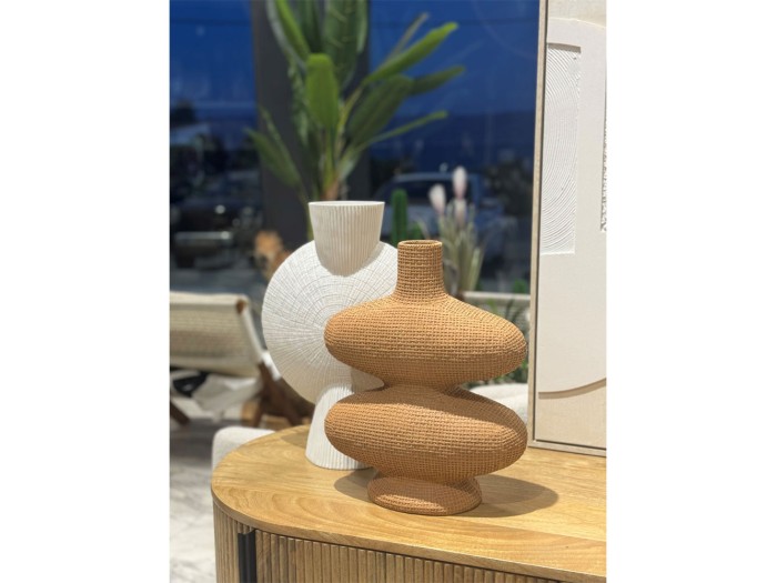 Τα διακοσμητικά βάζα Randi, κατασκευασμένα από ανθεκτικό polyresin, με την ιδιαίτερη ανάγλυφη υφή που θυμίζει γάζα, εντυπωσιάζουν με τις ζεστές καμπύλες και την αρμονική γεωμετρία τους. Οι αποχρώσεις του λευκού, μαύρου και της αγαπημένης terracotta συνδυάζονται τέλεια και μεταξύ τους, αλλά και με άλλα διακοσμητικά αντικείμενα ή βάζα από τη συλλογή μας, ανδεικνύοντας το στυλ σε όλους τους χώρους του σπιτιού ή του γραφείου.