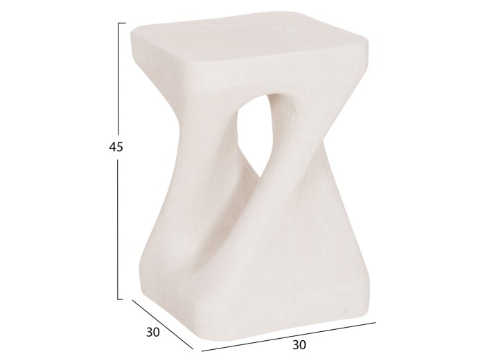 Το σκαμπό είναι κατασκευασμένο από polyresin (πολυρητίνη), ένα σύγχρονο συνθετικό υλικό υψηλής αντοχής που χρησιμοποιείται ευρέως σε premium διακοσμητικά αντικείμενα και έπιπλα design. Η πολυρητίνη προσφέρει σταθερότητα, ανθεκτικότητα στη χρήση και δυνατότητα δημιουργίας σύνθετων σχημάτων με ιδιαίτερη αισθητική. Η σαγρέ υφή στην επιφάνεια ενισχύει την αίσθηση φυσικού υλικού και χαρίζει στο αντικείμενο μια σύγχρονη, γλυπτική παρουσία.