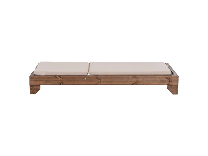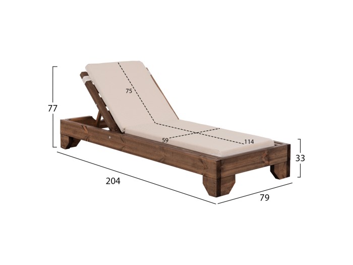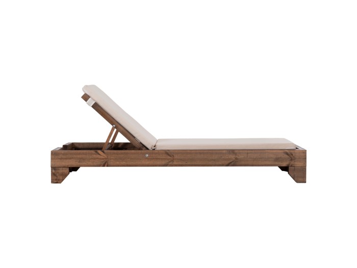 -Ολόκληρη η ξαπλώστρα έχει κατασκευαστεί από ξύλο πεύκου με εμποτισμό και επιπλέον στρώση με βερνίκι νερού. Το πεύκο είναι ένα μαλακό, λευκό ή ανοιχτό κίτρινο ξύλο το οποίο είναι ελαφρύ σε βάρος με ευθύγραμμα νερά ξύλου. Αντέχει στη συρρίκνωση, διόγκωση και κάμψη. Ο εμποτισμός υπό την ευρεία έννοια είναι ο χρωματισμός του ξύλου (συνήθως βερνίκια) με την μέθοδο της εμβάπτισης.
