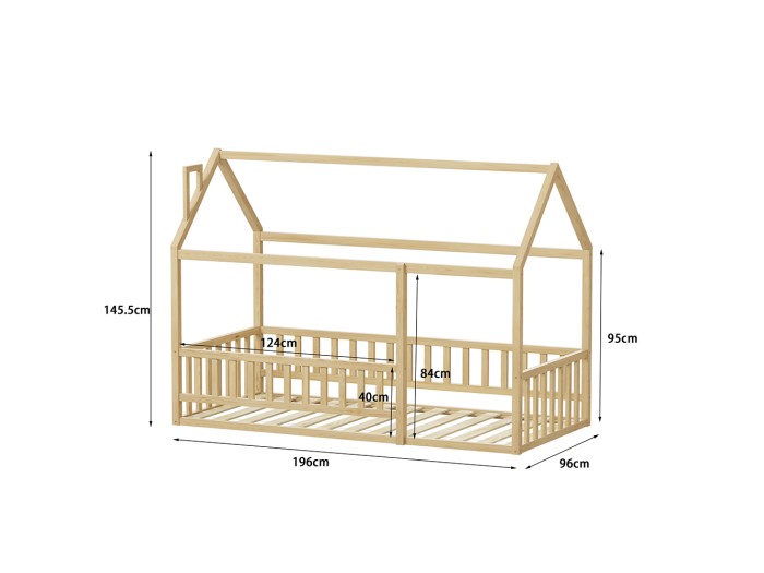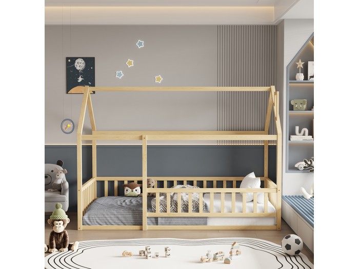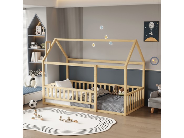 Σας παρουσιάζουμε το καινούργιο παιδικό κρεβάτι HOUSER. Είναι σε διάσταση για μονό στρώμα 90x190 εκ, και αποτελεί μια άριστης ποιότητας, κλασική και ασφαλή επιλογή για το παιδικό δωμάτιο μιας και είναι τύπου Montessori, που σημαίνει ότι έχει σχεδιαστεί σύμφωνα με το εκπαιδευτικό σύστημα Montessori, σύμφωνα με το οποίο τα παιδιά μαθαίνουν καλύτερα, όταν επιλέγουν μόνα τους τι θα κάνουν. Το χαμηλό ύψος κρεβατιού χωρίς πόδια, βοηθά να εξερευνούν την αυτονομία τους και να ανεβοκατεβαίνουν από το κρεβάτι τους ελεύθερα ανά πάσα στιγμή. Είναι ξύλινο σε ΦΥΣΙΚΟ χρώμα βαμμένο με αβλαβές μη τοξικό βερνίκι με βάση το νερό, ιδανικό για παιδιά. Το στρώμα τοποθετείται σε τάβλες κατασκευασμένες από ξυλεία κόντρα πλακέ. Όλο το κρεβάτι έχει σχήμα σπιτιού με καμινάδα που θα δώσει μια ευχάριστη, «ζεστή», και παιχνιδιάρικη όψη σε κάθε παιδικό δωμάτιο, ενώ διαθέτει κάγκελα περιμετρικά.
