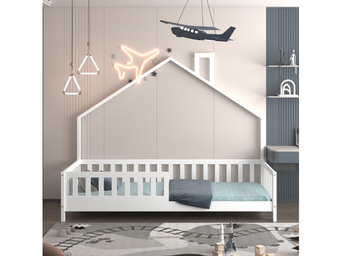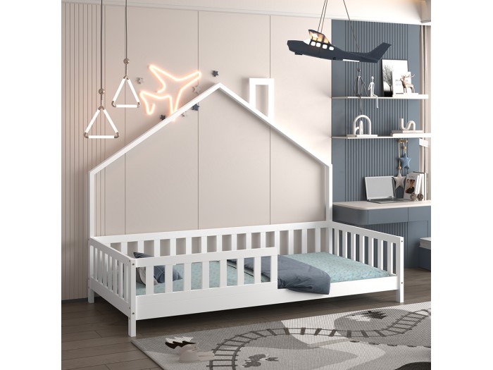 Σας παρουσιάζουμε το καινούργιο παιδικό κρεβάτι HOUSER. Είναι σε διάσταση για μονό στρώμα 90x190 εκ, και αποτελεί μια άριστης ποιότητας, κλασική και ασφαλή επιλογή για το παιδικό δωμάτιο μιας και είναι τύπου Montessori, που σημαίνει ότι έχει σχεδιαστεί σύμφωνα με το εκπαιδευτικό σύστημα Montessori, σύμφωνα με το οποίο τα παιδιά μαθαίνουν καλύτερα, όταν επιλέγουν μόνα τους τι θα κάνουν. Το χαμηλό ύψος κρεβατιού με τα χαμηλά πόδια, βοηθά να εξερευνούν την αυτονομία τους και να ανεβοκατεβαίνουν από το κρεβάτι τους ελεύθερα ανά πάσα στιγμή. Είναι ξύλινο σε ΛΕΥΚΟ χρώμα βαμμένο με αβλαβές μη τοξικό βερνίκι με βάση το νερό, ιδανικό για παιδιά. Το στρώμα τοποθετείται σε τάβλες κατασκευασμένες από ξυλεία κόντρα πλακέ. Η μία πλευρά του κρεβατιού έχει την φιγούρα σπιτιού με καμινάδα που θα δώσει μια ευχάριστη, «ζεστή», και παιχνιδιάρικη όψη σε κάθε παιδικό δωμάτιο, ενώ διαθέτει κάγκελα περιμετρικά.