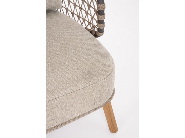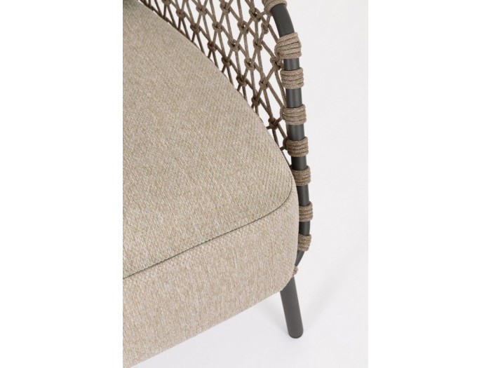Η χρήση του συνθετικού υφάσματος OLEFIN για το κάθισμα και τα μαξιλαράκια προσφέρει άνεση, ενώ ταυτόχρονα το OLEFIN είναι ανθεκτικό στην υπεριώδη ακτινοβολία του ήλιου και στο νερό, κάνοντάς τον ιδανικό για εξωτερικούς χώρους όπως κήπους, βεράντες ή πισίνες. Το αποσπώμενο κάλυμμα διευκολύνει το καθάρισμα και τη συντήρηση του καναπέ.