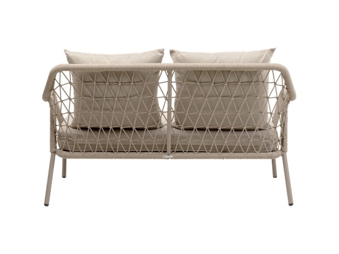 Τα άνετα μαξιλάρια καθίσματος και πλάτης δημιουργούν μια φιλόξενη lounge εμπειρία, ιδανική για στιγμές χαλάρωσης στον εξωτερικό χώρο. Η επένδυση από ανθεκτικό πολυεστερικό ύφασμα είναι ανθεκτική και πρακτική για καθημερινή χρήση, ενώ η πλέξη από πολυαιθυλένιο προσφέρει σταθερότητα και αντοχή στις εξωτερικές συνθήκες.