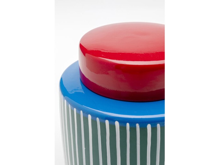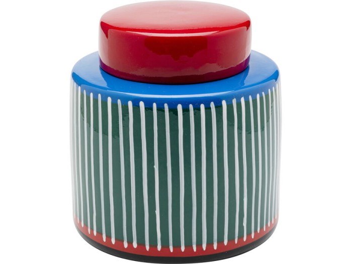 Ένα ιδιαίτερο διακοσμητικό δοχείο που ξεχωρίζει για τον παιχνιδιάρικο χαρακτήρα και την καλλιτεχνική του αισθητική. Με έντονα χρώματα και γραμμικό μοτίβο, συνδυάζει το μοντέρνο design με μια pop art διάθεση, δημιουργώντας ένα αντικείμενο που τραβά αμέσως το βλέμμα.
