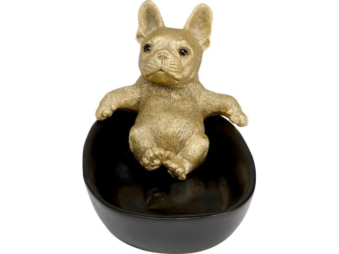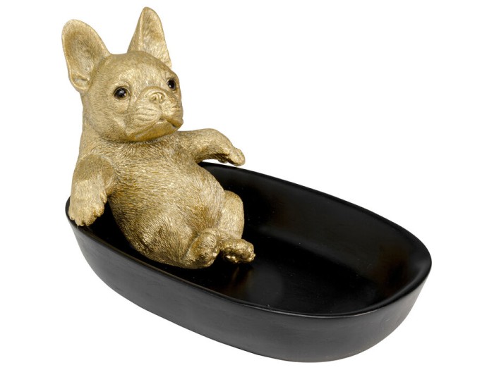 Αυτό το καλλιτεχνικό διακοσμητικό μπολ συνδυάζει κομψότητα και παιχνιδιάρικο χαρακτήρα, με έναν χρυσό μπουλντόγκ να ξεκουράζεται χαλαρά στην κορυφή του. Η έντονη αντίθεση ανάμεσα στη λαμπερή χρυσή φιγούρα και τη βαθιά μαύρη βάση δημιουργεί ένα statement αντικείμενο που ισορροπεί ανάμεσα στη luxury αισθητική και τη διακριτική δόση χιούμορ.