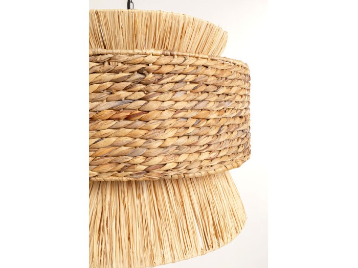 Η μοναδική του μορφή με διπλό καπέλο δημιουργεί ένα εντυπωσιακό παιχνίδι φωτός και σκιάς, αναδεικνύοντας το οργανικό υλικό και την υφή του ρατάν. Ο μεταλλικός θόλος (canopy) σε μαύρο φινίρισμα προσθέτει μοντέρνα αντίθεση, ενώ το ύψος του φωτιστικού είναι ρυθμιζόμενο (50–60 εκ.) για να προσαρμόζεται ιδανικά στις ανάγκες κάθε χώρου.
