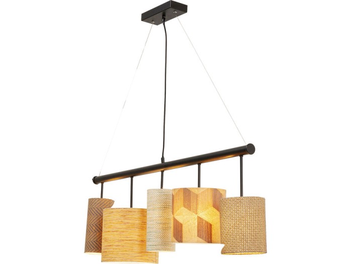 Ένα φωτιστικό που συνδυάζει αρμονικά διαφορετικές υφές, σχήματα και φυσικές αποχρώσεις, δημιουργώντας ένα ζεστό και ιδιαίτερο αποτέλεσμα. Τα πέντε καπέλα, με διαφορετικά μοτίβα και υφές σε τόνους καφέ και μπεζ, διαχέουν απαλά το φως, προσφέροντας μία cozy και φιλόξενη ατμόσφαιρα. Ο μαύρος μεταλλικός σκελετός δημιουργεί μία σύγχρονη αντίθεση, ισορροπώντας ιδανικά το πιο φυσικό, boho ύφος.
