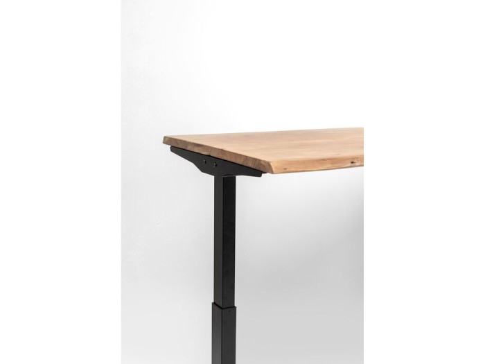 Ένα ορθογώνιο, ηλεκτρικά ρυθμιζόμενο σε ύψος γραφείο με μασίφ δρύινη επιφάνεια πάχους 3,5 cm και λακαρισμένο ατσάλινο πλαίσιο σε μαύρο χρώμα