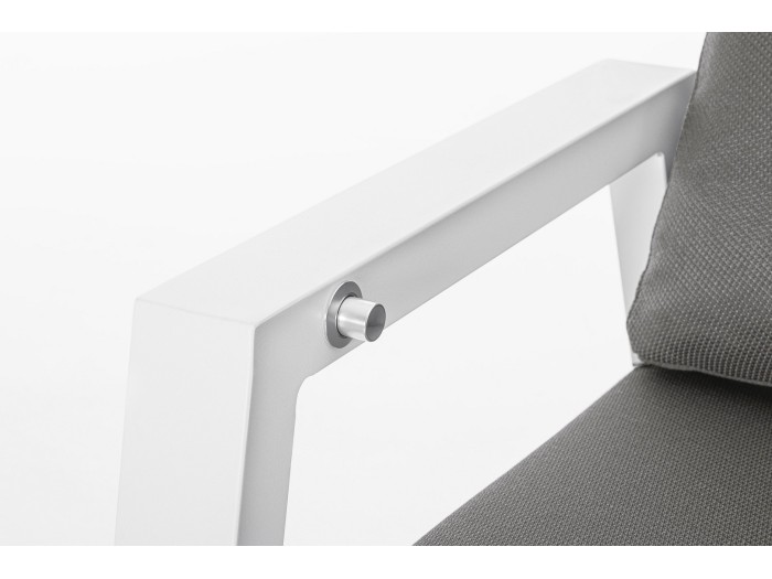 Διθέσιος καναπές εξωτερικού χώρου, ο οποίος έχει σκελετό από αλουμίνιο σε χρώμα λευκό και μαξιλάρια καθίσματος και πλάτης υφασμάτινα σε χρώμα γκρι. Υπάρχει δυνατότητα ανάκλισης της πλάτης. Συνδυάστε αυτόν τον καναπέ τέλεια με τα υπόλοιπα έπιπλα της σειράς matrix. Μια εξαιρετική επιλογή για τον κήπο σας!| Μήκος | 152 |
