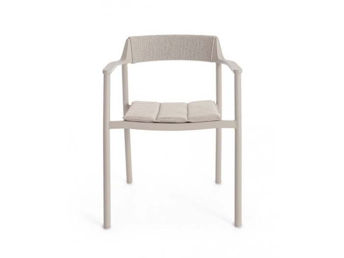 Η καρέκλα κήπου διαθέτει σκελετό από αλουμίνιο με ηλεκτροστατική βαφή (πολυεστέρας), προσφέροντας ανθεκτικότητα και προστασία από τις καιρικές συνθήκες. Η πλάτη είναι επενδεδυμένη με υφαντό σχοινί πολυεστέρα, προσφέροντας εξαιρετική υποστήριξη και αισθητική.