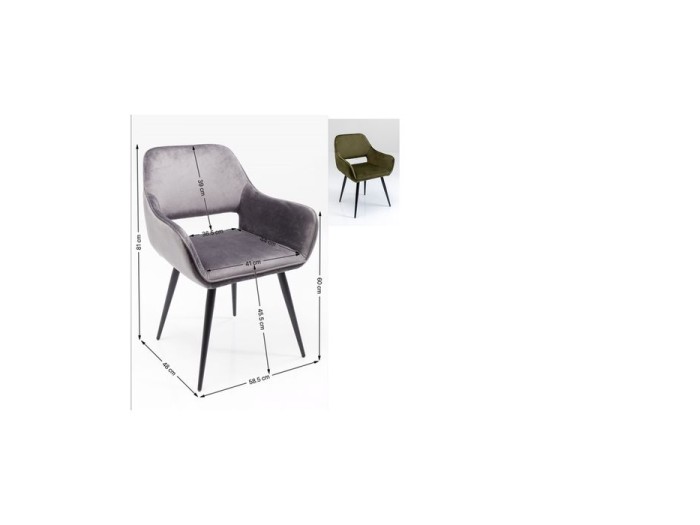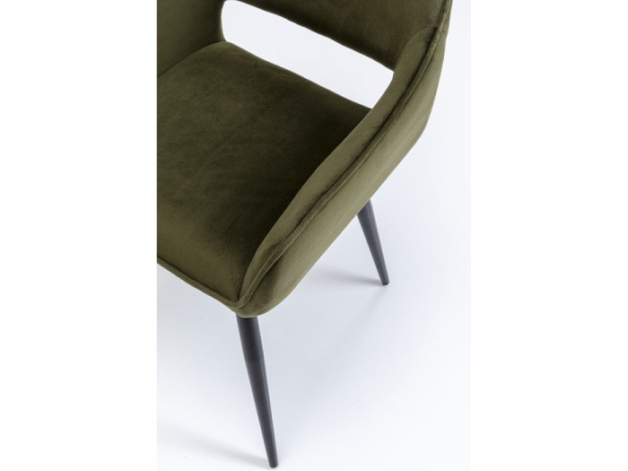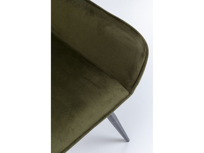 Πράσινη καρέκλα με μπράτσα, σε υφή βελούδου με κομψή περιμετρική ραφή (keder seam) και μαύρα, μεταλλικά πόδια