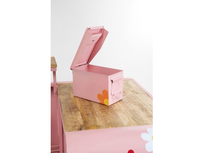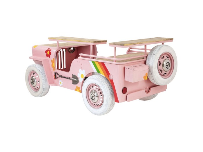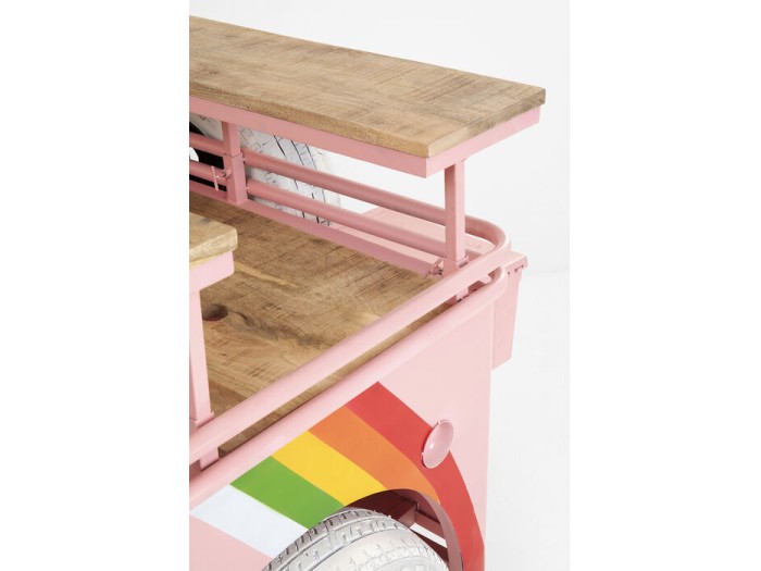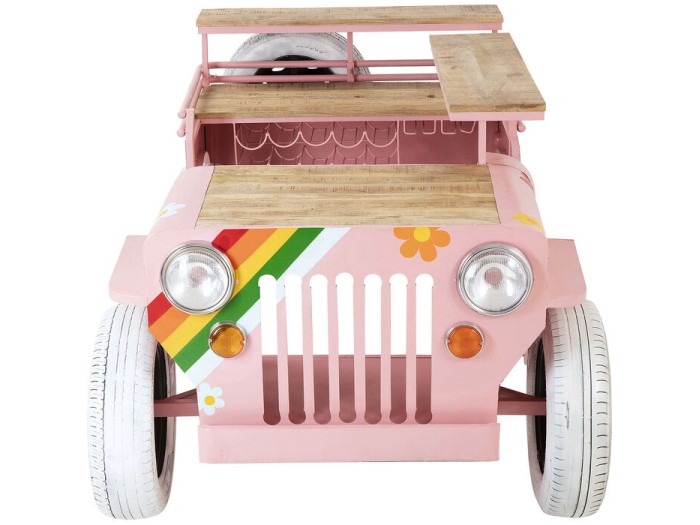 Από τα καλύμματα των τροχών με το λογότυπο της ειρήνης μέχρι τους προβολείς, τα φλας, το μεταλλικό κουτί και πολλές άλλες λεπτομέρειες, αυτό το μπάρ είναι ένα εντυπωσιακό αυτοκίνητο που κανείς δεν μπορεί να αγνοήσει. Το μοντέρνο ροζ χρώμα με τα λουλούδια και τα ουράνια τόξα το κάνει ιδιαίτερα γοητευτικό. Αν θέλετε να διασκεδάσετε τους καλεσμένους σας και έχετε μεγάλο καθιστικό/τραπεζαρία, αυτό το ασυνήθιστο έπιπλο θα πετύχει τον στιλιστικό στόχο. Τοποθετήστε εδώ τα υλικά για τα ποτά και τα μπουκάλια σας, διακοσμήστε τα ράφια με κομψά ποτήρια και καράφες και γιορτάστε το τέλος της ημέρας ως ζευγάρι ή με καλεσμένους. Το μπαρ Flower Power μας υπόσχεται κοκτέιλ πάρτι που κανείς δεν θα ξεχάσει.Ροζ καροτσάκι μπαρ με πολλές λειτουργίες, 104 x 241 x 119 cm (Υ/Β/Δ)