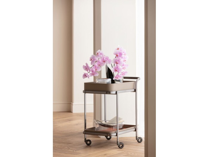 Ένα κομψό trolley με χαρακτήρα! Ο μοντέρνος συνδυασμός υφασμάτινης υφής με λευκές διακοσμητικές ραφές και λεπτομέρειες σε πορτοκαλί, μαζί με μεταλλικό σκελετό σε ασημί ματ φινίρισμα, προσδίδει στο έπιπλο αυτό μια premium αισθητική. Είτε χρησιμοποιηθεί ως μίνι μπαρ με ποτήρια και εκλεκτά κρασιά, είτε ως έξυπνος αποθηκευτικός βοηθός στην κουζίνα ή το μπάνιο, αυτό το έπιπλο προσφέρει ευελιξία, στιλ και πρακτική λειτουργία σε κάθε χώρο.