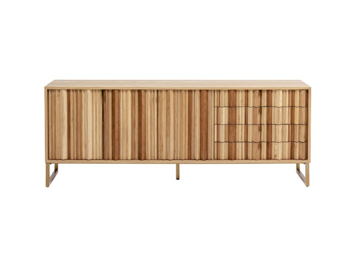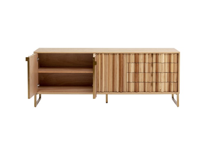 Σχεδόν κανένα άλλο υλικό εκτός από το ξύλο δεν συμβολίζει τόσο πολύ το θαύμα της φύσης. Κάθε κομμάτι είναι μοναδικό και αλάνθαστο. Ο σχεδιασμός της συλλογής Concertina Nature δίνει στο υλικό ξύλο κάθε ελευθερία να αναπτύξει πλήρως τον χαρακτήρα του, τα χρώματά του, τους κόκκους και τα μοτίβα του. Αυτός ο χαρακτήρας εκφράζεται στα γλυπτά μέτωπα. Προκειμένου να εκφραστεί πλήρως η ομορφιά του ξύλου και του μπροστινού σχεδιασμού, ο κυρίως αυτού του επίπλου διατηρείται απλό και σκανδιναβικό με καθαρή γραμμή. Το Concertina σχεδιάστηκε από τον Δανό σχεδιαστή Morten Georgsen αποκλειστικά για την KARE. Η φιλοσοφία του: να συνδυάζει αισθητική και λειτουργία με απλό τρόπο.Μπουφές ανοιχτό καφέ με χειροποίητη πρόσοψη σε φυσικά χρώματα ξύλου, 74x186x40 cm
