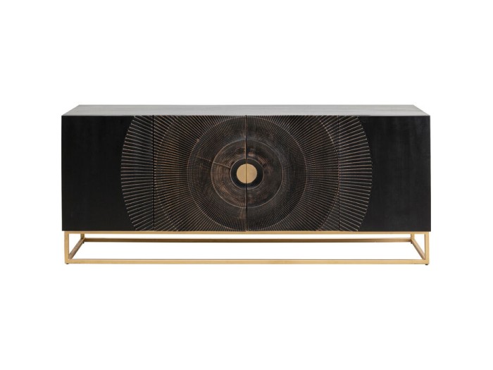 Με αυτό το μαύρο μπουφέ μπορείτε να φέρετε μια ανάσα φρέσκου αέρα στους τέσσερις τοίχους σας σε χρόνο μηδέν. Το καθαρό, ορθογώνιο σχήμα του μπουφέ εναρμονίζεται με τις ευθείες γραμμές του χρυσού μεταλλικού σκελετού. Ο μπουφές είναι βέβαιο ότι θα γίνει το αγαπημένο σας έπιπλο χάρη στον ιδιαίτερο σχεδιασμό της πρόσοψης. Τα στρογγυλά σκαλίσματα δημιουργούν ένα τρισδιάστατο εφέ και δεν είναι μόνο οπτικό highlight αλλά και υπέροχα στο άγγιγμα. Αυτό το μοναδικό κομμάτι έχει επίσης κατασκευαστεί στο χέρι και προσδίδει μια ασύγκριτη γοητεία σε κάθε δωμάτιο. Με μασίφ ξύλο ερυθράς και ατσάλι με επίστρωση πούδρας, το συμπαγές ντουλάπι παίζει στην premium κατηγορία όσον αφορά τα επιλεγμένα υλικά από τα οποία είναι κατασκευασμένο. Μπορεί επίσης να χρησιμοποιηθεί ως πίνακας τηλεόρασης και προσφέρει άφθονο αποθηκευτικό χώρο. Ένα ανθεκτικό έπιπλο που σίγουρα θα διατηρήσει την αξία του.